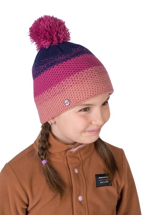 Dívčí zimní čepice Hannah Ola JR malaga nabízí kombinaci moderního designu a maximálního tepelného komfortu. Vnitřek čepice je kompletně podšitý hřejivým fleecem, který udrží hlavu v teple i během mrazivých dnů. Akrylová příze se barevně prolíná a čepici zdobí bohatá střapatá bambule na vršku, zatímco dekorativní logo label na dolním lemu dodává stylový detail.
