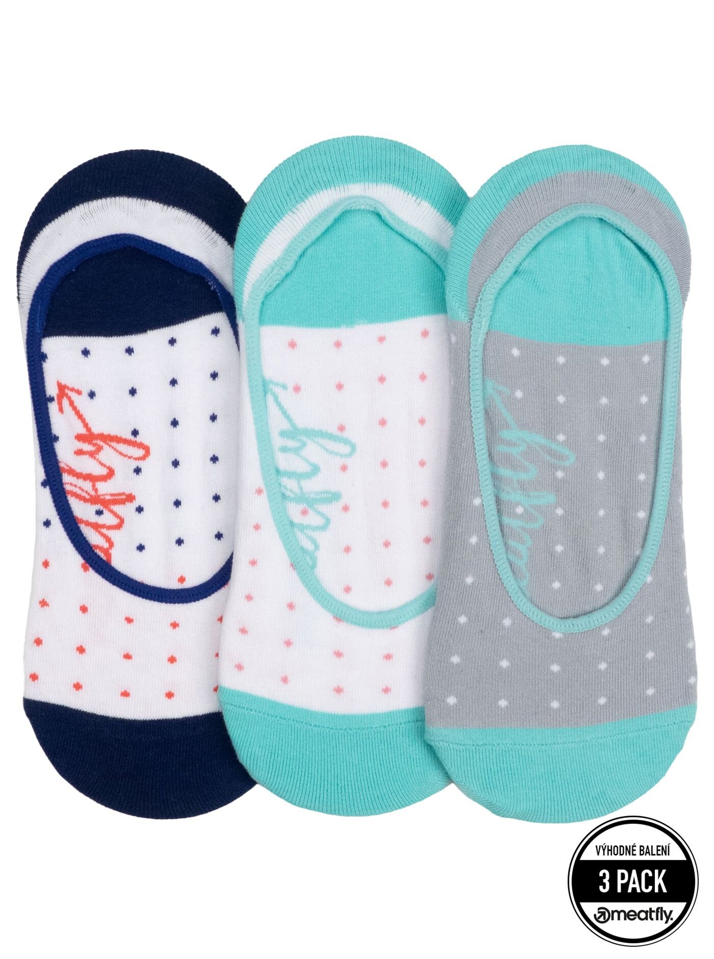 Dámské nízké ponožky Meatfly Low blue dots 3 pack do balerín a tenisek, které nesklouzávají. Díky silikonové protiskluzové aplikaci na patě zůstávají na místě i při celodenním nošení. Pevný a elastický materiál s vysokým podílem bavlny zajistí pohodlí a výdrž. V balení najdeš 3 páry v různých designech.