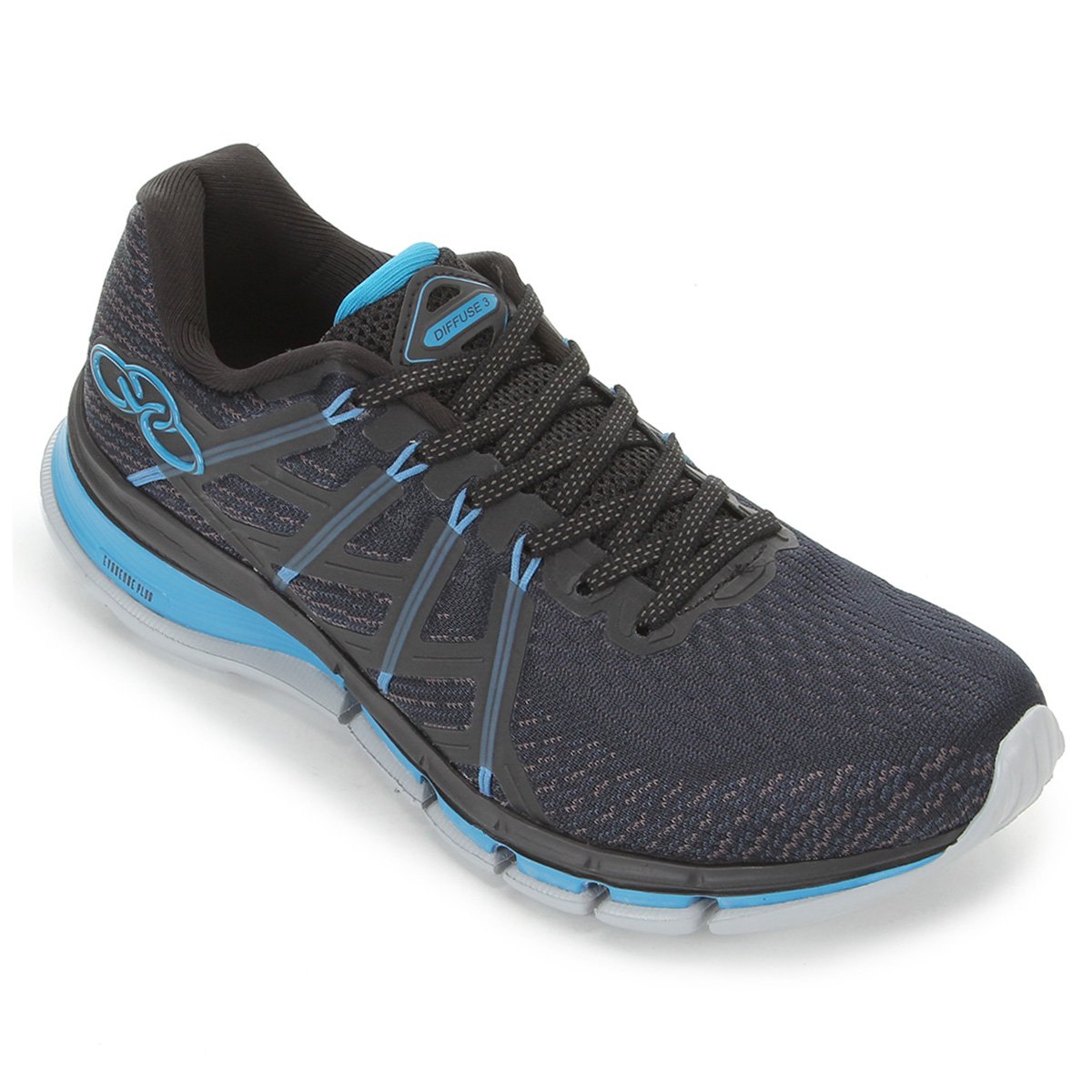 Pánské superlehké tenisky OLYMPIKUS DIFFUSE 3 black/teal blue. Sportovní boty jsou vyrobeny z různobarevné tkaniny Jacquard se strategickými otvory v horní části tenisek. Tenisky jsou lehke a prodyšné. V podrážce se kombinuje dvojitá vrstva Evasense Plus a Eva Pro, což zajišťuje rychlé zotavení, měkkost, pohodlí a odpružení při procházkách, bězích a krátkých cvičeních.