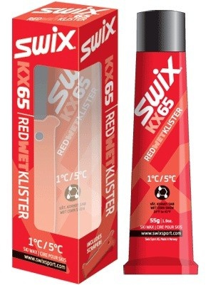SWIX KX65 red klister 55g je stoupací vosk na běžky určený na vlhký a mokrý hrubozrnný sníh.